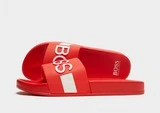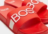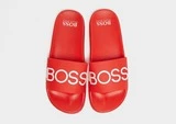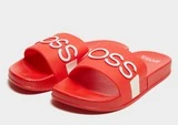 Schlüpfe mit diesen Casual Slides von BOSS in den Urlaubsmodus. Diese Pantoletten in roter Farbe sind aus glattem, strapazierfähigem Synthetikmaterial für dauerhaften Komfort. Sie verfügen über einen gepolsterten Riemen zum Fixieren und ein geformtes Fußbett für eine bequeme Passform. Sie haben eine griffige Gummi-Außensohle für Traktion und ist mit dem charakteristischen BOSS-Branding versehen.